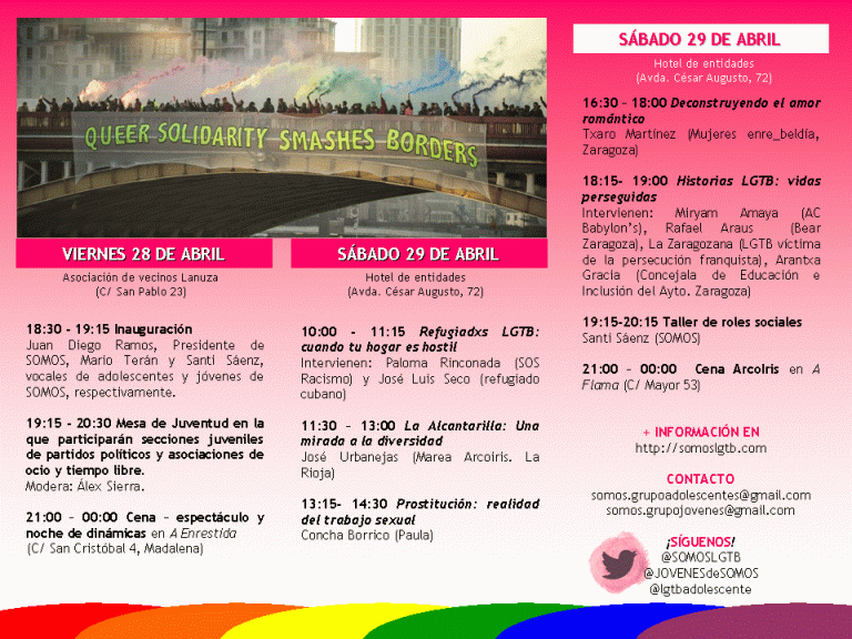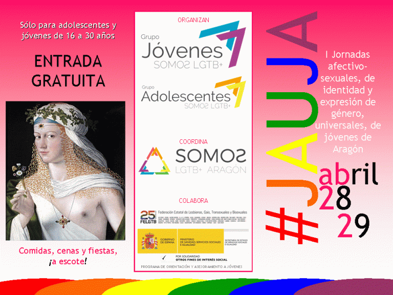 Los Grupos de Adolescentes y Jóvenes de SOMOS, en Aragón, nos invitan a participar gratuitamente de la #JAUJA, una jornada programada íntegramente por adolescentes y jóvenes LGTB+ de Aragón y dirigidas íntegramente a adolescentes y jóvenes de entre 16 y 30 años.