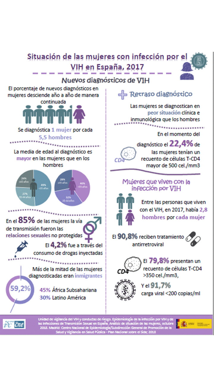 En el último informe de epidemiología de VIH y otras ITS en mujeres en España, las mujeres representan, cuantitativamente, un pequeño grupo dentro de la epidemia de VIH en nuestro país, si bien tienen características y necesidades diferenciales, por ejemplo, más de la mitad de los nuevos diagnósticos de VIH en mujeres son inmigrantes. También se diagnostican cada vez más mayores, tanto las españolas como las que proceden de otros países.