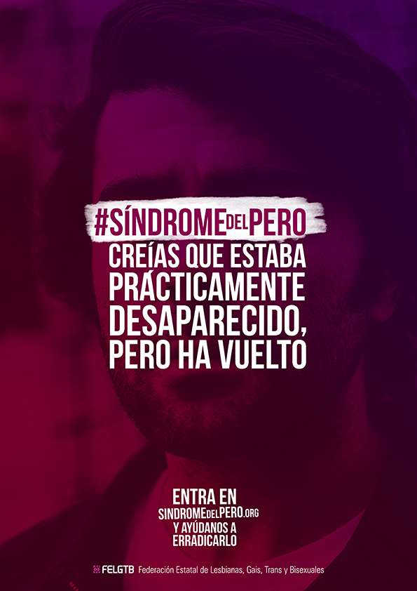 La Federación Estatal de Lesbianas, Gais, Trans y Bisexuales (FELGTB) lanza este martes, 9 de abril, su nueva campaña “El Síndrome del Pero”. Se trata de una iniciativa que pretende combatir los discursos de odio contra la población LGTBI facilitando herramientas de contraargumentación a todas aquellas personas que se sienten ofendidas ante la reaparición y proliferación de determinados mensajes LGTBIfóbicos.