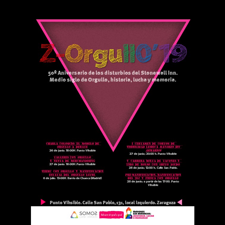 Durante este Z-Orgull0’19, el orgullo de SOMOS, volveremos a disfrutar de los «Talleres con orgullo«, de la «V Carrera Mixta de Tacones y Tiro de Bolso con grito agudo«, de la Manifestación del 28J de Zaragoza co-organizada por la Plataforma 28J, y de la Manifestación Estatal del Orgullo LGTBI en Madrid convocada por COGAM y FELGTB (con su tradicional vermú previo del voluntariado de la manifestación) y, como novedades, disfrutaremos del «Certamen de cortos de visibilidad lésbica ‘Mayores Sin Armarios’ de la FELGTB», de una «Fiesta pos-manifestación el 28J» y de una «Charla-coloquio sobre el modelo del Orgullo» que iniciará la agenda de este 2.019.