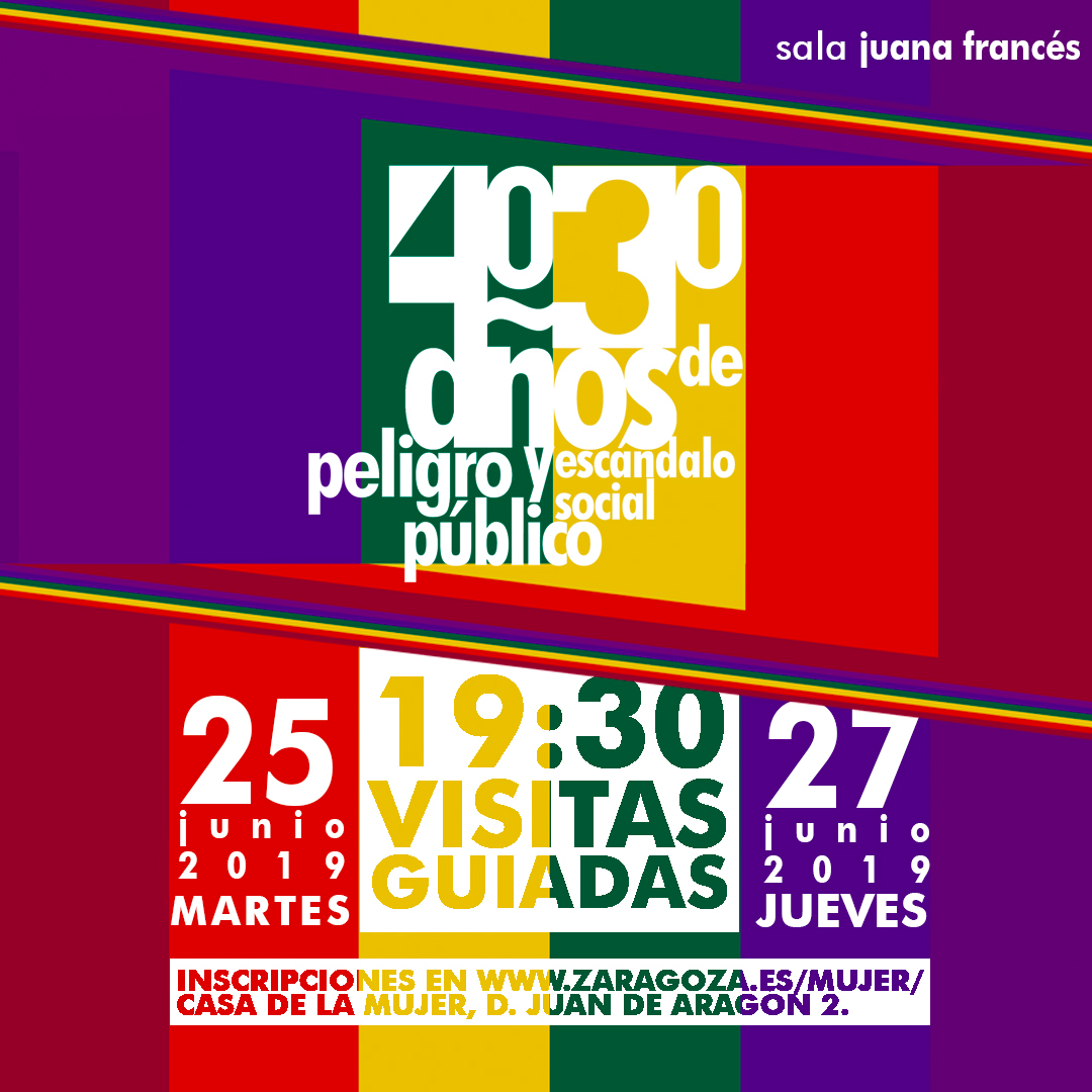 Desde el Servicio de Igualdad del Ayuntamiento de Zaragoza se han organizado visitas guiadas a la exposición «40/30 de peligro público y escándalo social«, los días 25 y 27 de junio a las 19,30 h.