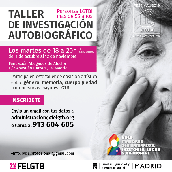 Taller de investigación autobiográfico para personas LGTBI mayores de 55 años 29 septiembre, 201928 septiembre, 2019SOMOSLGTB INSCRÍBETE enviando un email a administracion@felgtb.org o llamando al número de teléfono 913 604 605 ¡COMPARTE ESTA INFORMACIÓN! Haz clic para enviar un enlace por correo electrónico a un amigo (Se abre en una ventana nueva) Correo electrónico Haz clic para compartir en X (Se abre en una ventana nueva) X Haz clic para compartir en Facebook (Se abre en una ventana nueva) Facebook Haz clic para compartir en WhatsApp (Se abre en una ventana nueva) WhatsApp Haz clic para compartir en LinkedIn (Se abre en una ventana nueva) LinkedIn Haz clic para compartir en Telegram (Se abre en una ventana nueva) Telegram