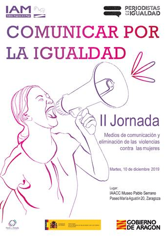 El Instituto Aragonés de la Mujer y la Asociación de Periodistas por la Igualdad han organizado la actividad de formación: Comunicar por la Igualdad. II Jornada sobre medios de comunicación y eliminación de las violencias contra las mujeres el Martes, 10 de diciembre de 2019 en el IAACC Pablo Serrano (Paseo Mª Agustín, 20). La entrada es libre hasta completar aforo.