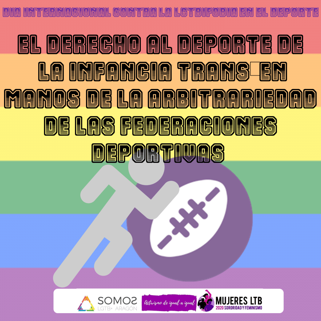 SOMOS, a través de la Federación Estatal de Lesbianas, Gais, Trans y Bisexuales (FELGTB), la Agrupación Deportiva Ibérica LGTBI (ADI) y Deporte y Diversidad denuncian que, actualmente, el derecho de la infancia y adolescencia trans a acceder libremente a la práctica deportiva depende de la voluntad de las federaciones deportivas que deciden arbitrariamente si una persona puede competir o no en la categoría correspondiente a su género.