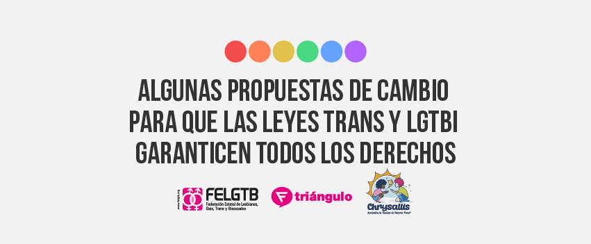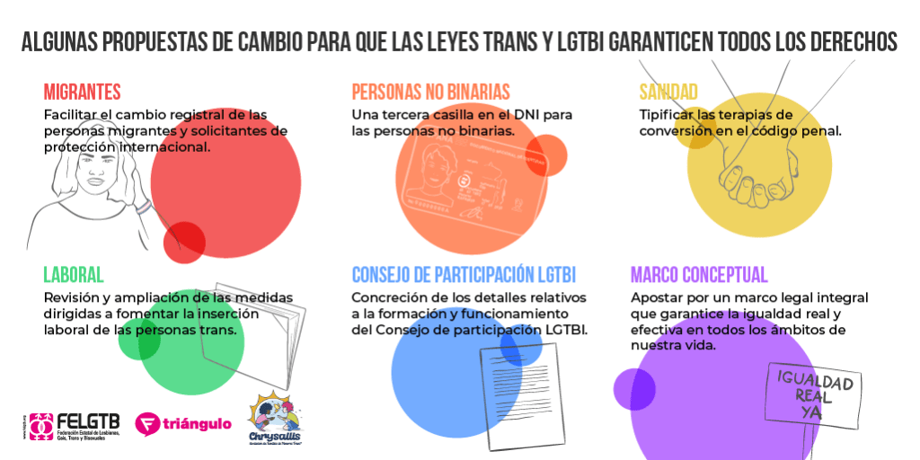 La Federación Estatal de Lesbianas, Gais, Trans y Bisexuales, FELGTB, a la cual pertenecemos como entidad de pleno derecho, Fundación Triángulo y Chrysallis, Asociación de Familias de Menores Trans* presentan algunas de las propuestas de cambio a los borradores publicados la semana pasada por el Ministerio de Igualdad que los colectivos consideran imprescindibles para que las futuras leyes trans y LGTBI garanticen todos los derechos del colectivo.