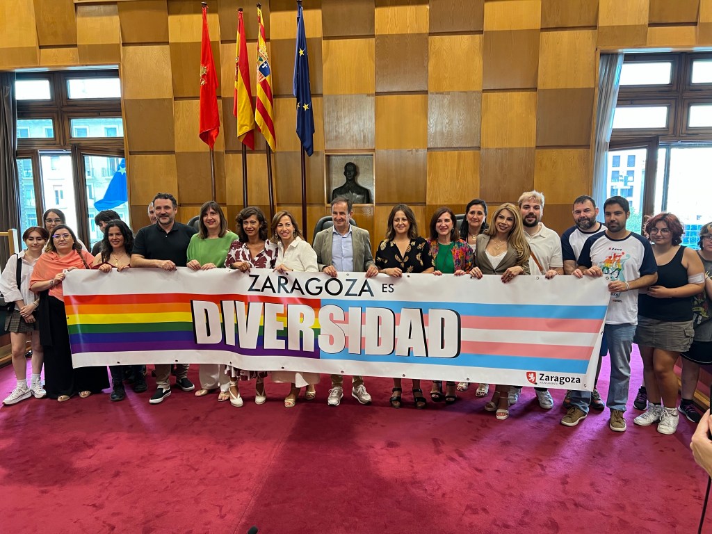 El ayuntamiento de zaragoza vuelve a colgar la pancarta lgtbi en el ayuntamiento representando así la pluralidad de la Ciudad de Zaragoza . Somos ha eatado en el acto de la colocación de la pancarta este 28j día del orgullo LGTBI