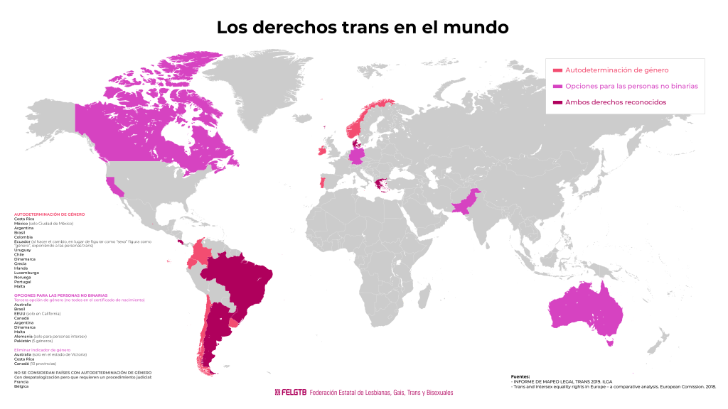 SOMOS y FELGTB recuerdan que Naciones Unidas insta a los estados a tomar “las medidas legislativas, administrativas y de cualquier otra índole que sean necesarias para respetar plenamente y reconocer legalmente el derecho de cada persona a la identidad de género que ella defina para sí”; la Comisión Europea promueve la autodeterminación trans como parte de su estrategia para igualdad LGTBI 2020-2025 y la OMS ha dejado de considerar la transexualidad una enfermedad mental.
