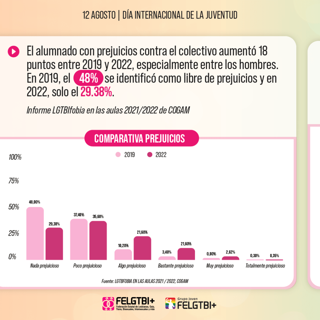 Y es que, según el informe LGTBIfobia en las aulas 2021/ 2022 de COGAM, el alumnado con prejuicios contra el colectivo aumentó 18 puntos entre 2019 y 2022, especialmente entre los hombres. En 2019, el 48% se identificó como libre de prejuicios y en 2022, solo lo hizo el 29.38%.