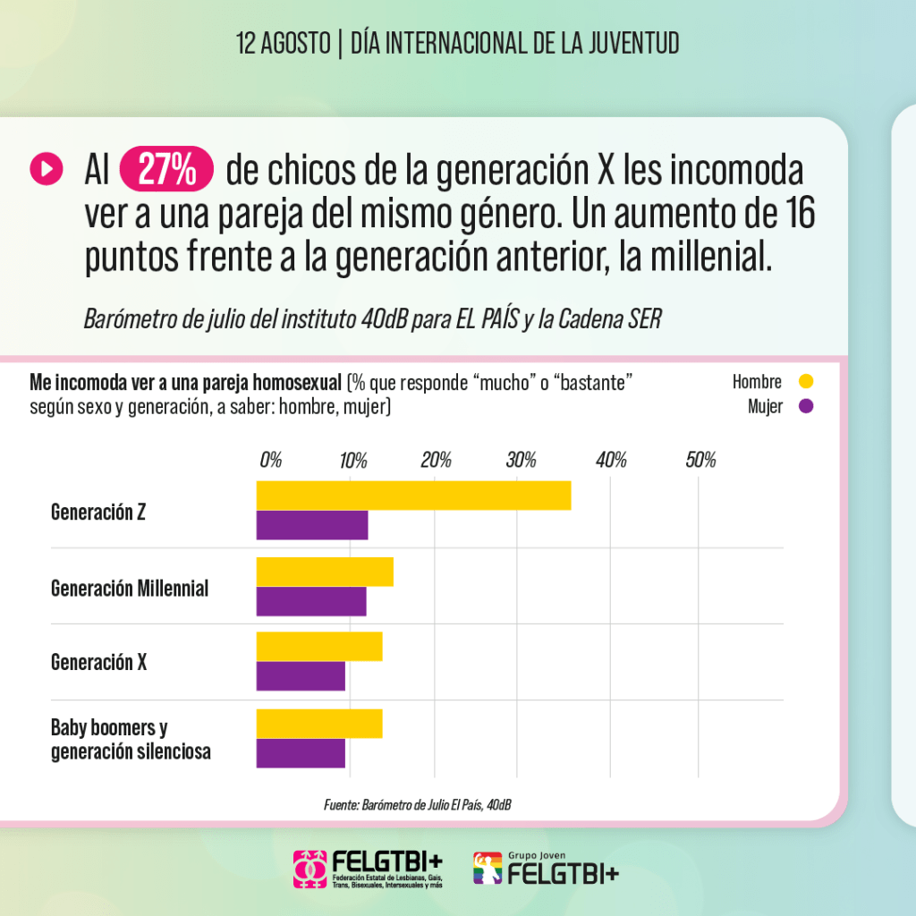 · Según el Barómetro de Julio de El País, a un 27% de los chicos jóvenes de la generación z les incomoda ver parejas del mismo género, 16 puntos más que los hombres de la generación millenial.