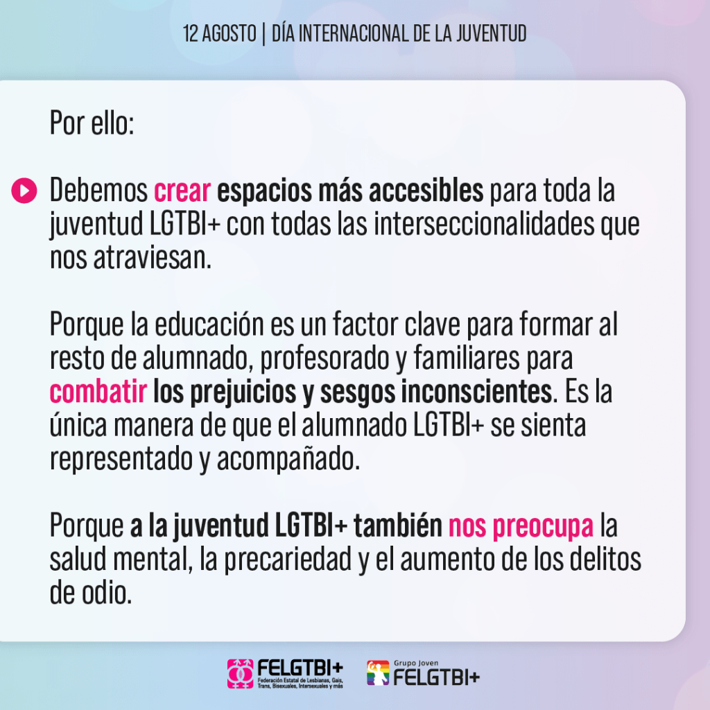 Con motivo del Día Internacional de la Juventud, que se conmemora este lunes, 12 de agosto, SOMOS y la Federación Estatal de Lesbianas, Gais, Trans, Bisexuales, Intersexuales y más (FELGTBI+) reivindica políticas educativas en diversidad “más decididas”, ante el aumento de la LGTBIfobia entre los hombres jóvenes, que han revelado estudios recientes.