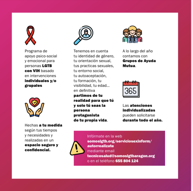 Hay dos fórmulas complementarias: (1) a través del acompañamiento en tu proceso por el técnico de salud y VIH y (2) a través de los Grupos de Ayuda Mutua para personas LGTBI con VIH. Puedes asistir a uno o a los dos espacios. Todos ellos, seguros, confidenciales, gratuitos, profesionales, cercanos y con un trato de igual a igual.